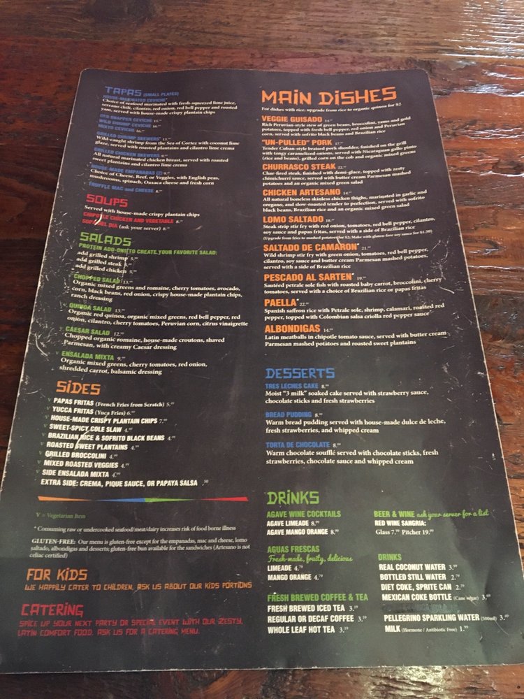 The menu boasts a range of popular items that highlight fresh, quality ingredients. Start with the Yuca Fritas, perfectly seasoned and fried to golden crispness, or dive into the aromatic Chicken Artesano, marinated in garlic and oregano, then slow-roasted to tender perfection. The refreshing Jicama Salad adds a vibrant crunch with citrus notes, while the housemade Plantain Chips provide the ideal snack with every bite.